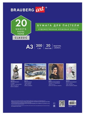 Бумага для пастели большая А3, 20 л., 200г/м2, слоновая кость гознак 200 г/м2, тиснение Холст, BRAUBERG ART, 126305 информация: