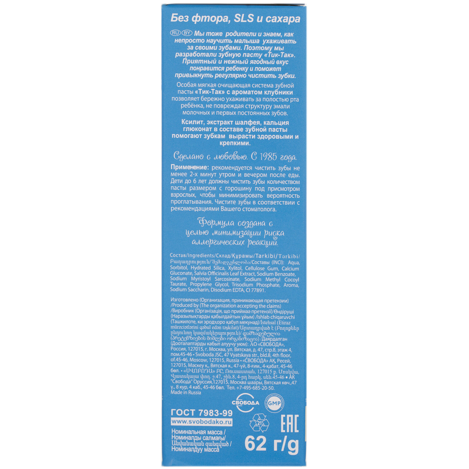 Зубная паста свобода Тик-Так с ароматом клубники 0+, 62 г информация: