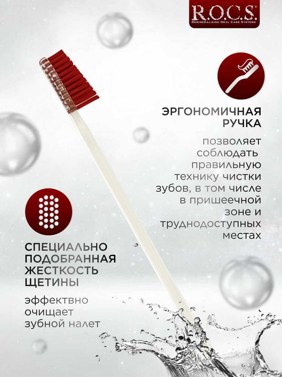 | Способ применения | Зубная щетка R.O.C.S. с жесткой щетиной разработана при участии стоматологов и обеспечивает качественную гигиену полости рта. Изделие предназначено для регулярного ухода. Рекомендуется менять через 2-3 месяца после использования. |