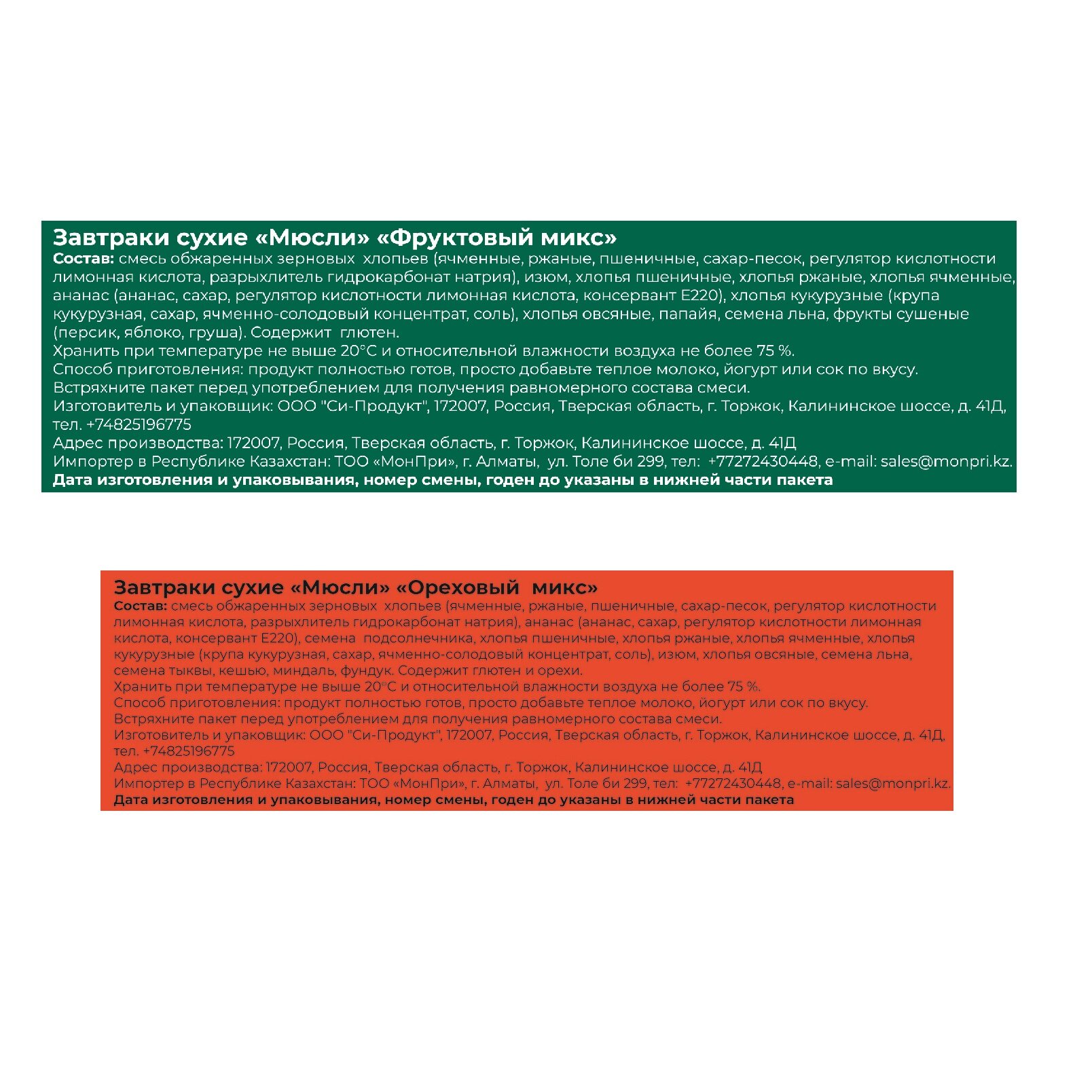 | Состав | Овсяные хлопья / хлопья пшеницы / соль / сахар / орехи / сушеные фрукты / пшеничные отруби / кукурузные хлопья / разрыхлитель / ячменные хлопья / лимонная кислота / изюм / подсолнечные семена / семена льна / семена тыквы / глютен |
