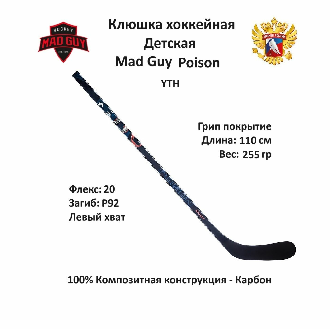 Клюшка хоккейная Mad Guy Poison YTH LH P92 F20 Grip информация: