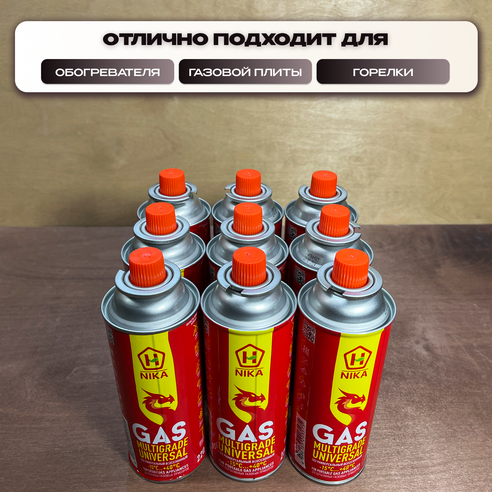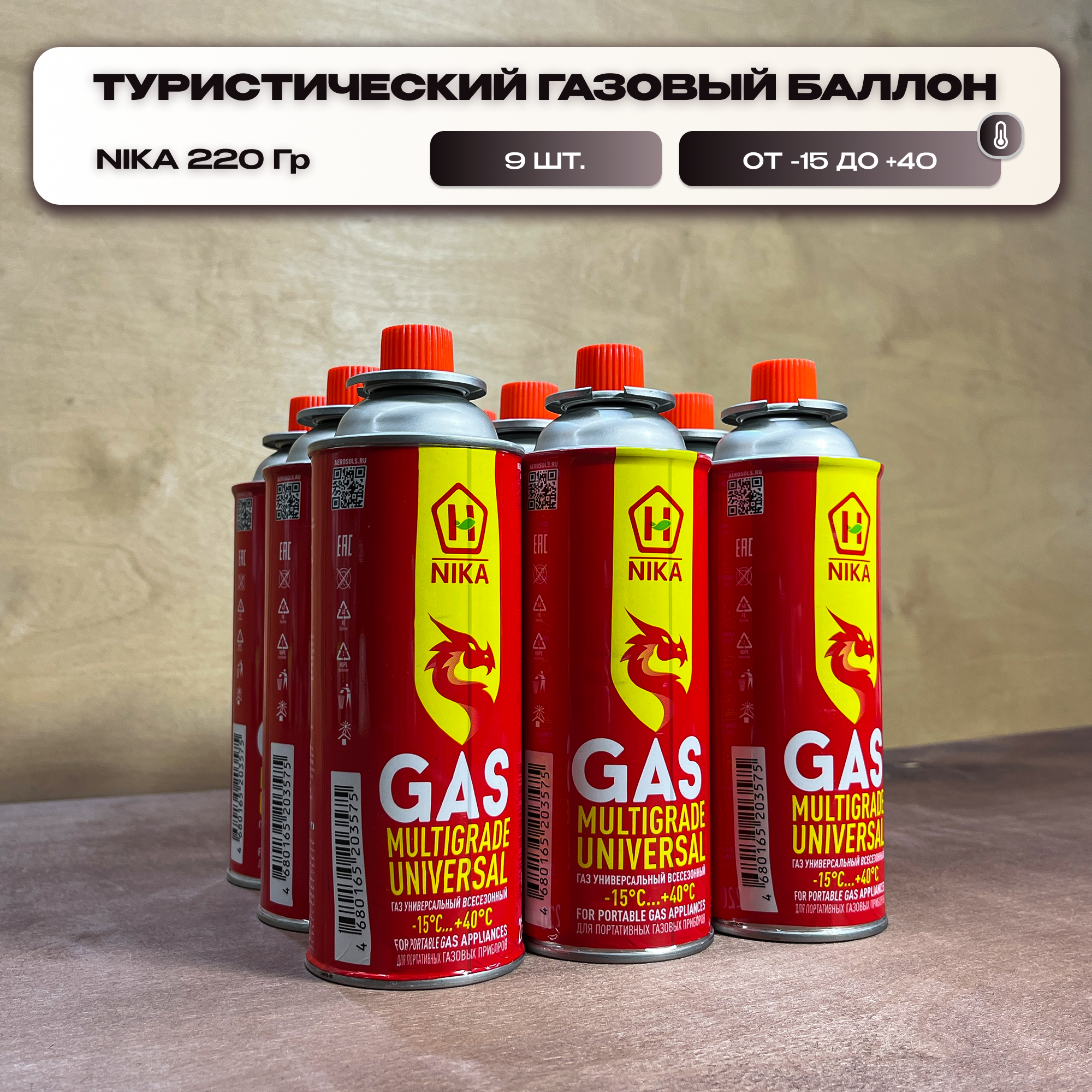 Туристические газовые баллончики Nika 9 Шт, цанговый, 220 Гр, от -15 до +40, всесезонный, для газовой горелки, плитки и обогревателя информация: