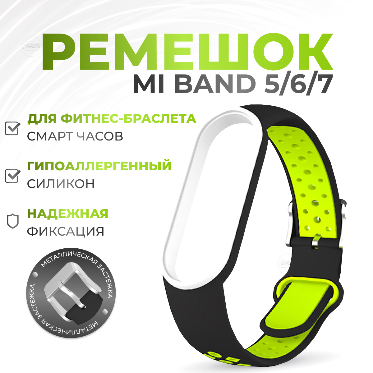10 цен на Силиконовый ремешок для смарт часов Xiaomi Mi Band 5,6,7 / браслет на фитнес трекер/ Черный-лайм