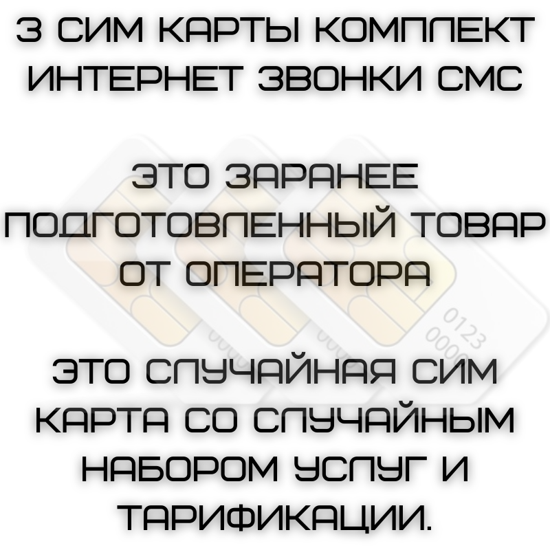 | Дополнительная информация | 3 Сим карты комплект интернет звонки смс Это заранее подготовленный товар от оператора Это случайная сим карта со случайным набором услуг и тарификации. |