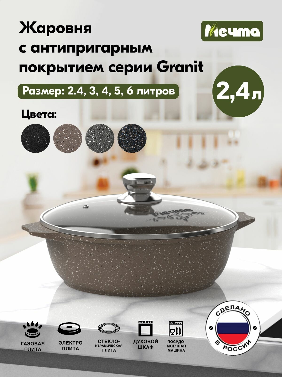 Кастрюля-жаровня мечта 2.4л, антипригарное покрытие, стеклянная крышка Гранит, алюминий литой brown информация: