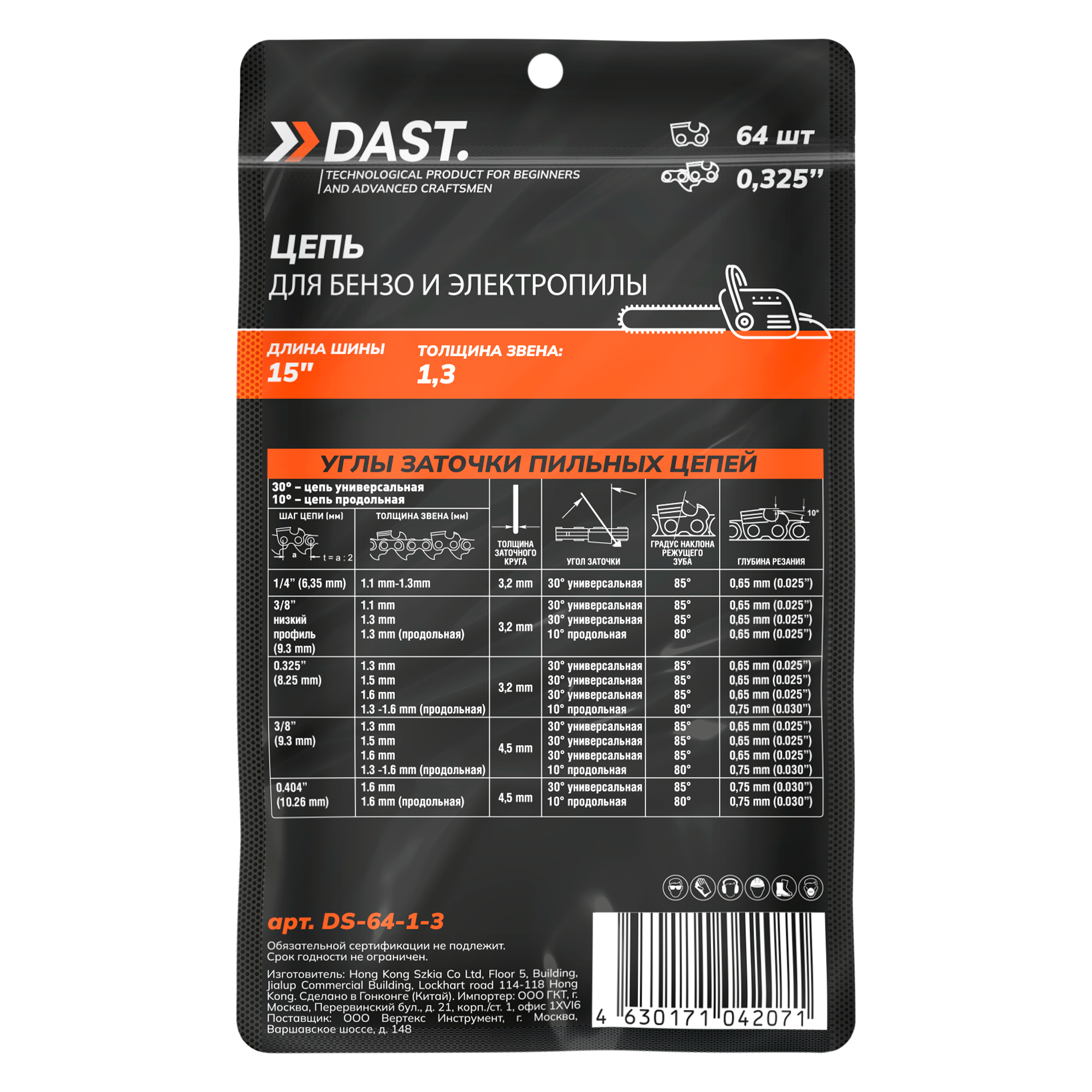 Пильная цепь DAST 0.325"-1.3-64 звеньев, шаг 0.325", паз 1.3 мм, для шины 15 дюймов 468 ₽