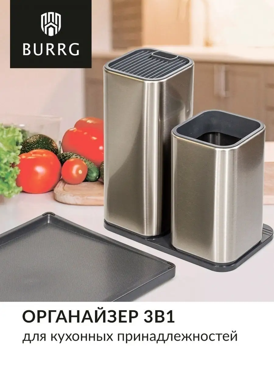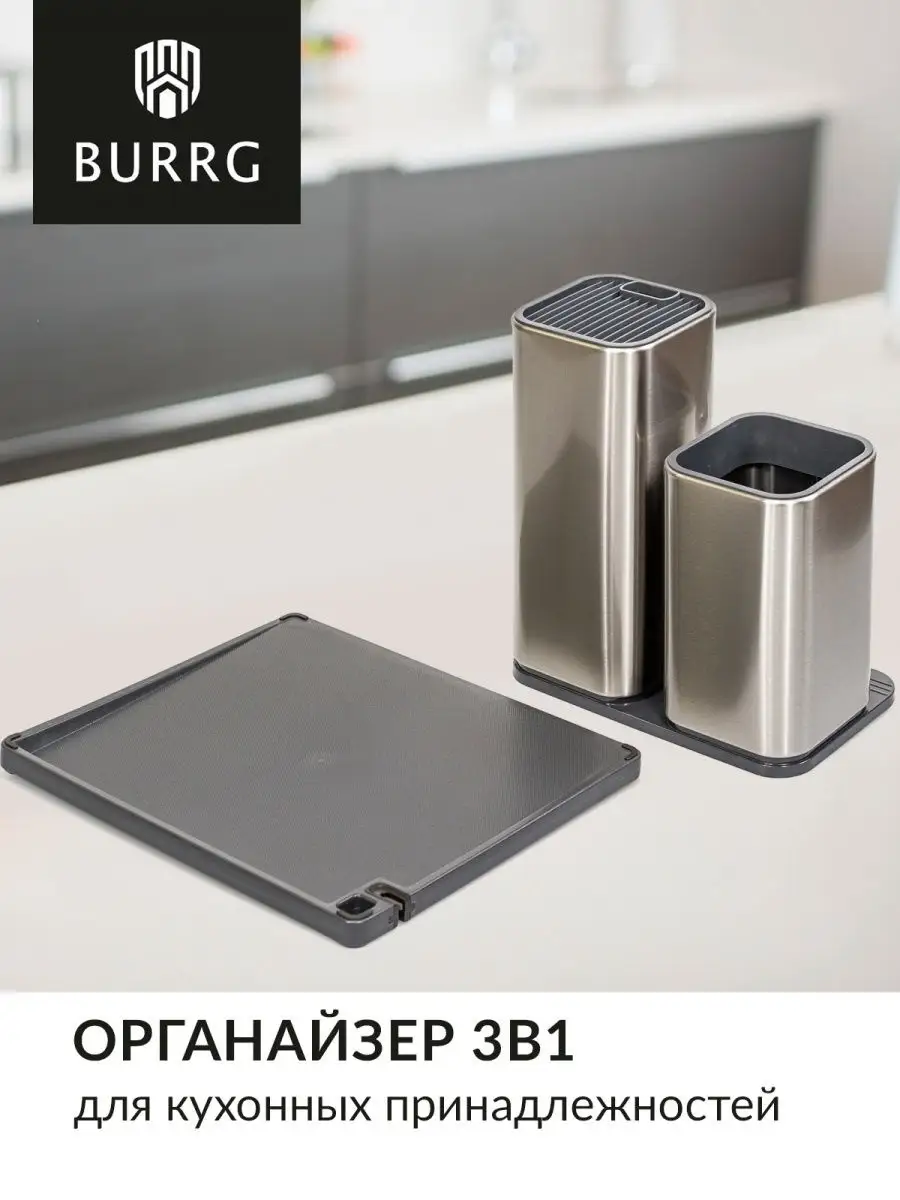 Отзывы на Burrg Набор подставок для ножей и столовых приборов 3в1, 36х21х13 см, металлический, разделочная доска с точилкой в комплекте