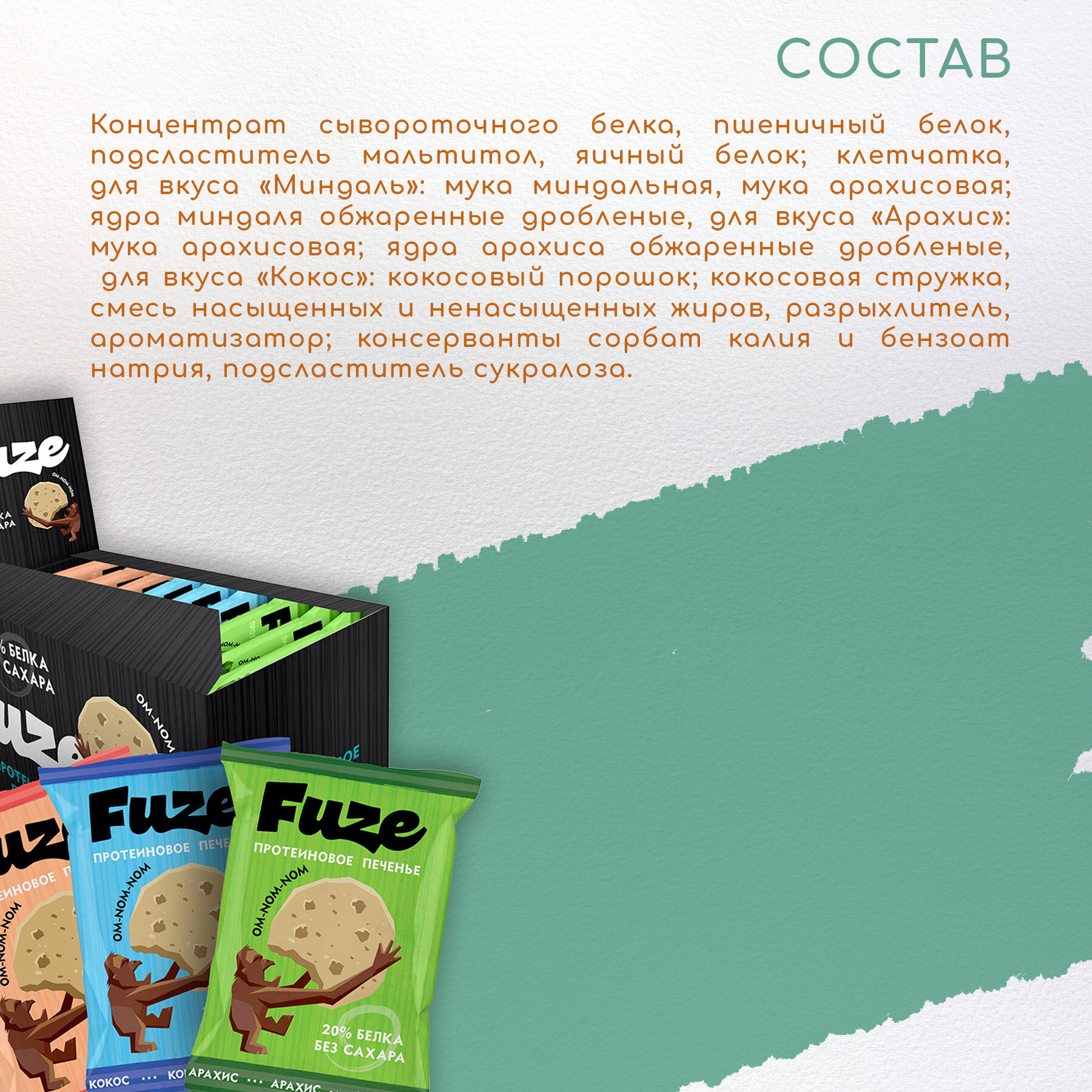 Печенье протеиновое без сахара Fuze. Мультибокс: Миндаль, Арахис, Кокос (бокс = 9 уп.) информация: