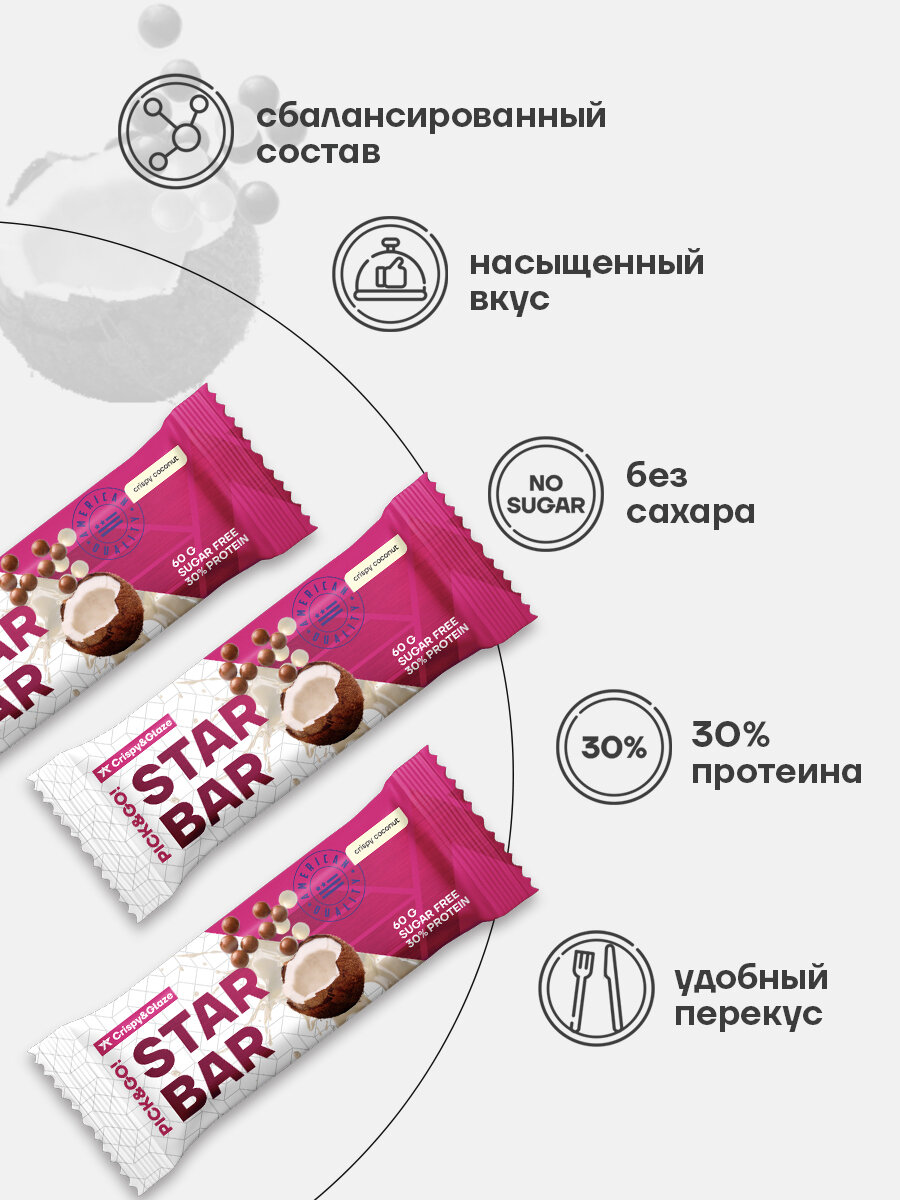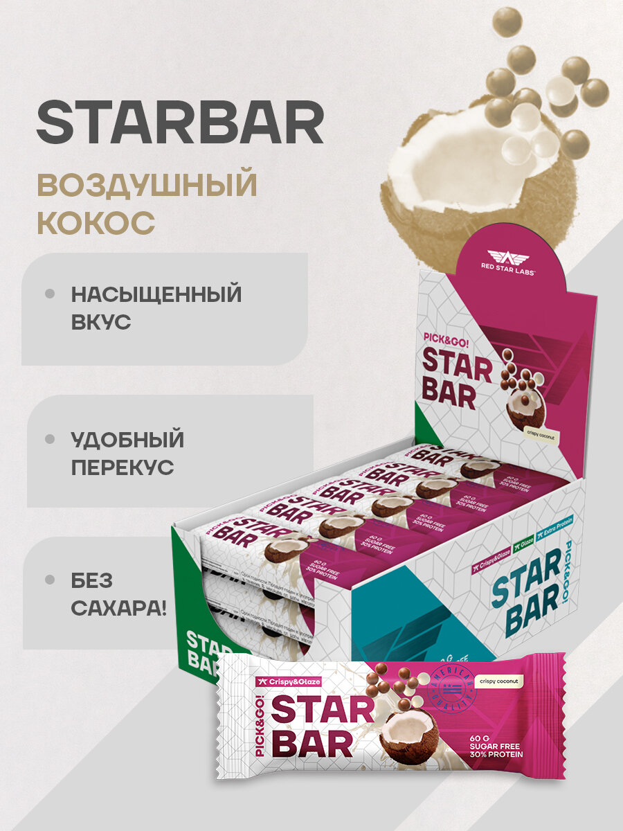 Протеиновые батончики без сахара с хрустящими шариками STARBAR Crispy&Glaze, вкус: воздушный кокос 12 шт по 60 г информация: