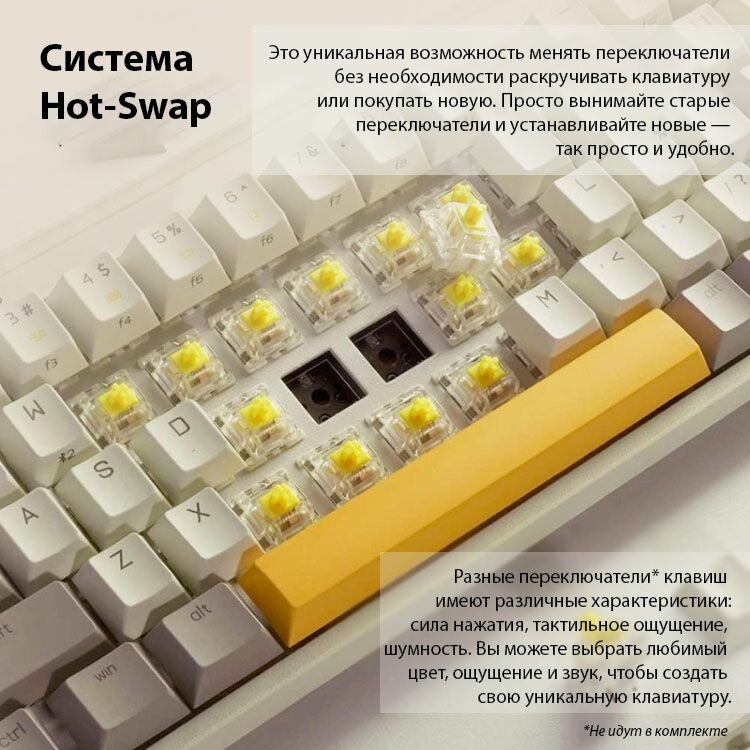 | Комплектация | 1 * Механическая клавиатура 1 * Приемник 1*2,4G 1 * ключ Съемник 1 * Съемник переключателя 1 * кабель Type-C 1 * Краткое руководство 1 * Руководство пользователя 5 * Сменный колпачок |