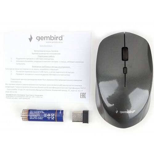 Мышь беспроводная Gembird MUSW-250-1, 2.4ГГц, 3 кнопки плюс колесо кнопка,1600DPI серый информация: