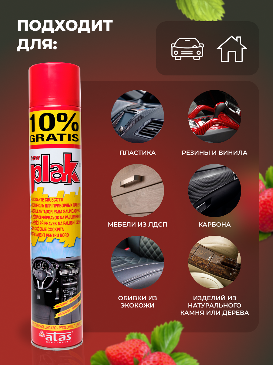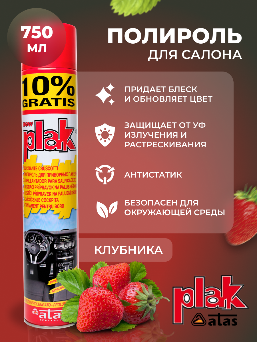 10 цен на Полироль салона PLAK 750 мл (аэр.). Клубника. Применение: пластик Тип: полироль Объём: 0.75 EAN-13: 8002424001672 Тип: уход и очистка