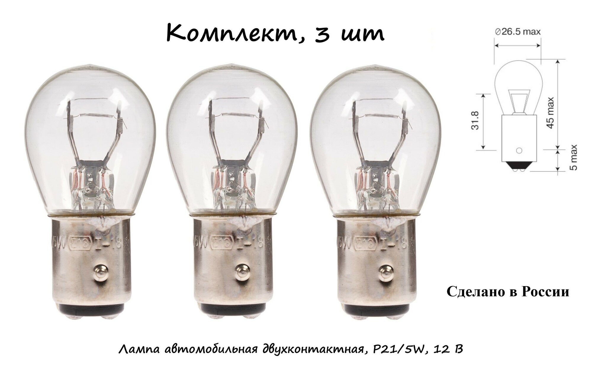 Лампа автомобильная двухконтактная, P21/5W, 12 В, (BAY15d), комплект 3 шт информация: