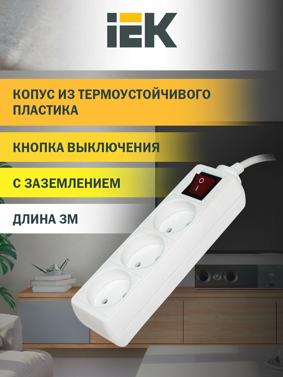 Отзывы на Удлинитель с выключателем IEK УЗК-выкл, 2 x 0,75 мм², без заземления, 3 розетки, 3 м, белый