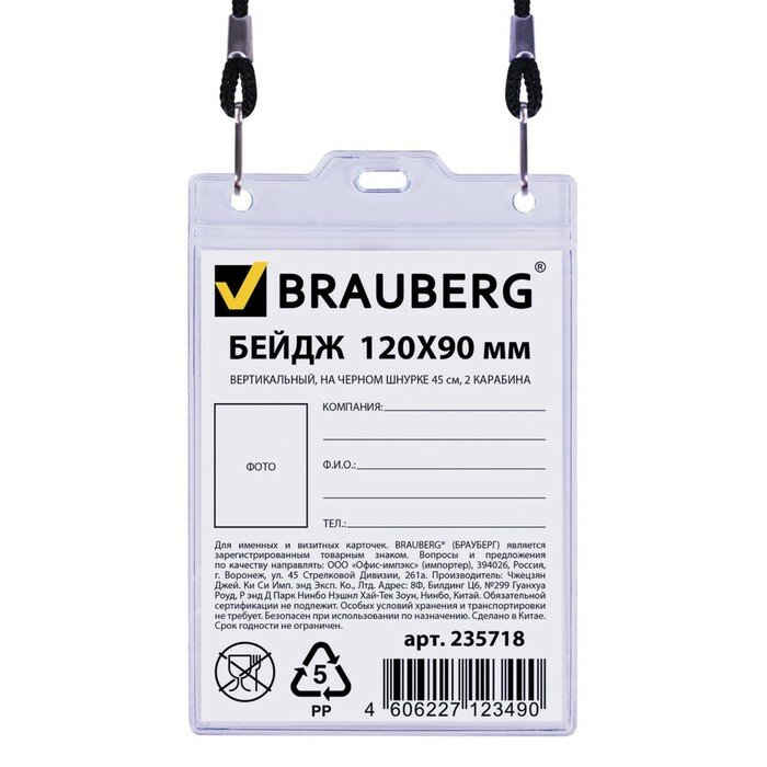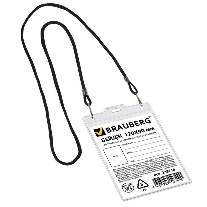 Бейдж вертикальный 90 х 120 мм, BRAUBERG, на черном шнурке 45 см, 2 карабина информация: