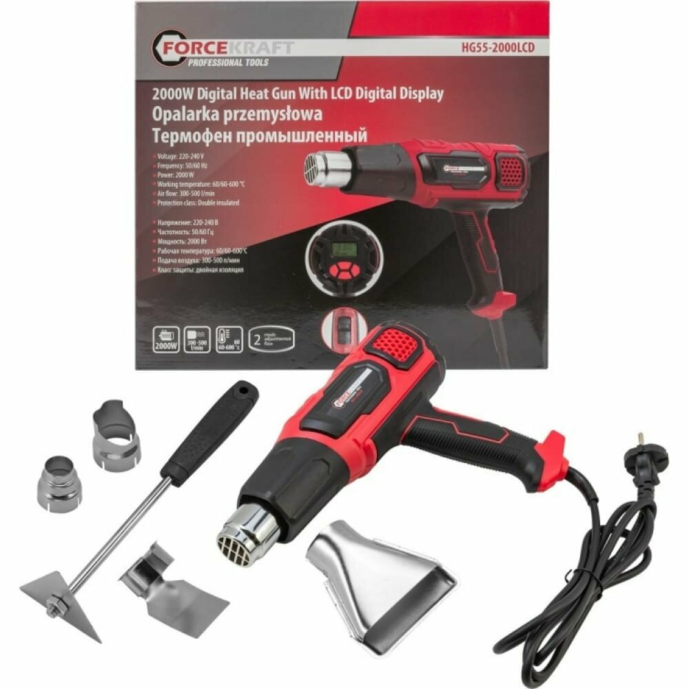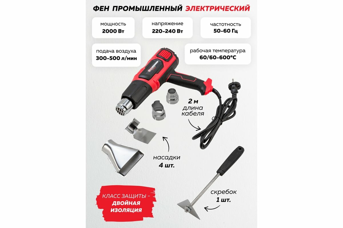 Фен промышленный электрический с дисплеем и насадками (60-600С, 300-500л/мин) информация:
