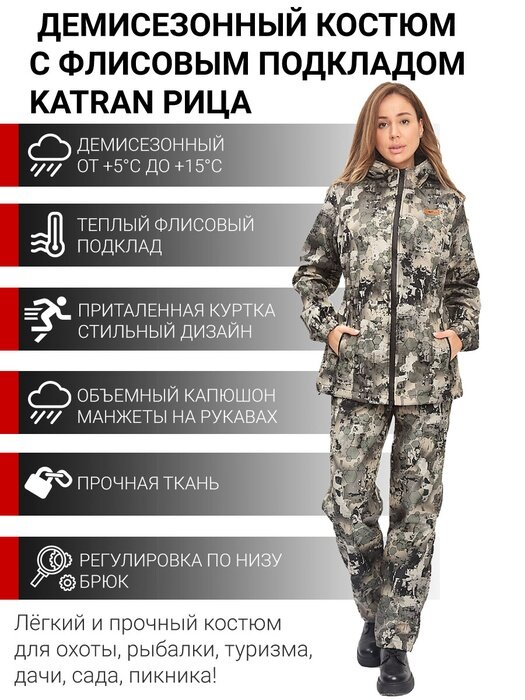 Отзывы на Костюм женский демисезонный для рыбалки и охоты подклад флис KATRAN рица (полофлис, серые соты), Размер: 48-50 Рост: 158-164