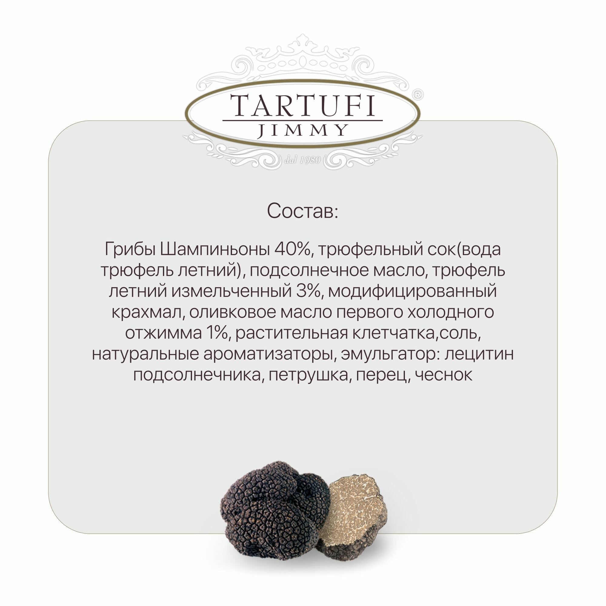 Состав | грибы Шампиньоны 40%, трюфельный сок(вода трюфель летний), подсолнечное масло, трюфель летний измельченный 3%, модифицированный крахмал, оливковое масло первого холодного отжимма 1%, растительная клетчатка,соль, натуральные ароматизаторы, эмульгатор: лецитин подсолнечника, петрушка, перец, чеснок |