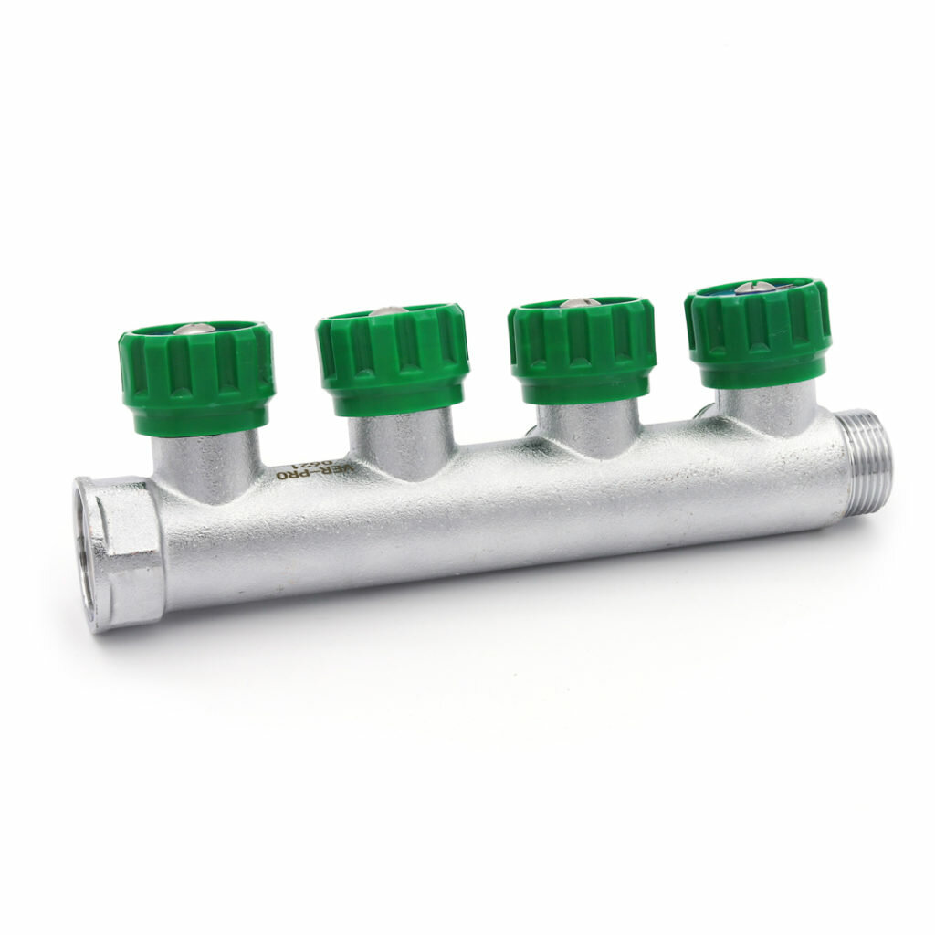 10 цен на Коллектор 3/4"х1/2"НР - 4 выхода плоский с регулировочными вентилями для водоснабжения хром VER404-A