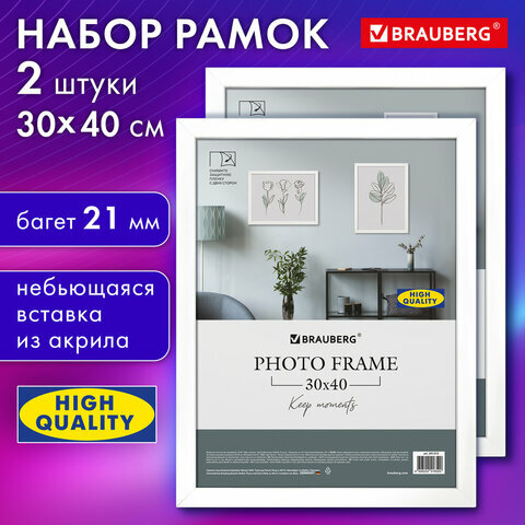 Рамка 30х40 см небьющаяся, комплект 2 штуки, багет 21 мм, МДФ, BRAUBERG "Idea", белая, 391394 информация: