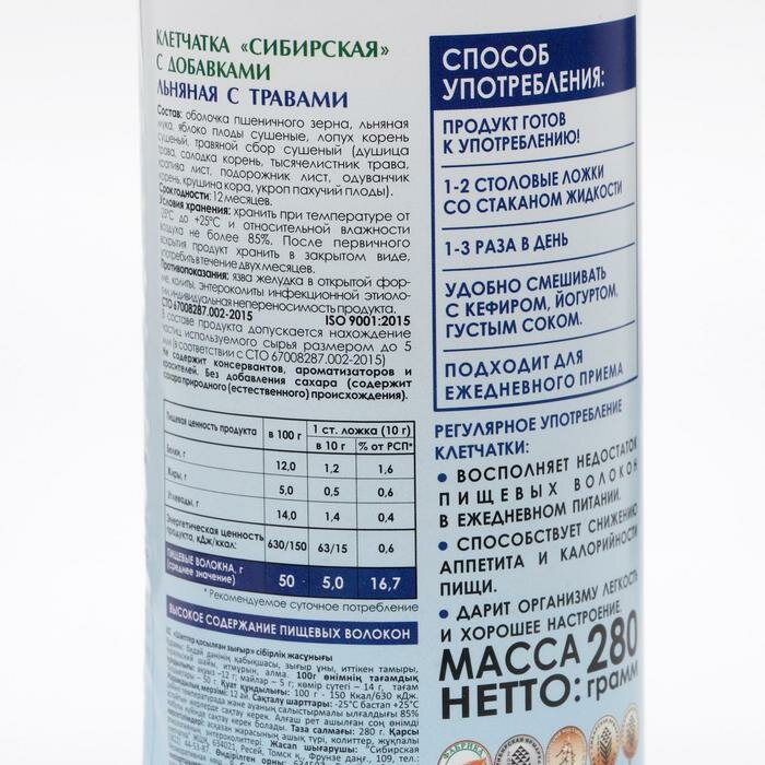 Сибирская клетчатка "Льняная с травами", 280 г информация: