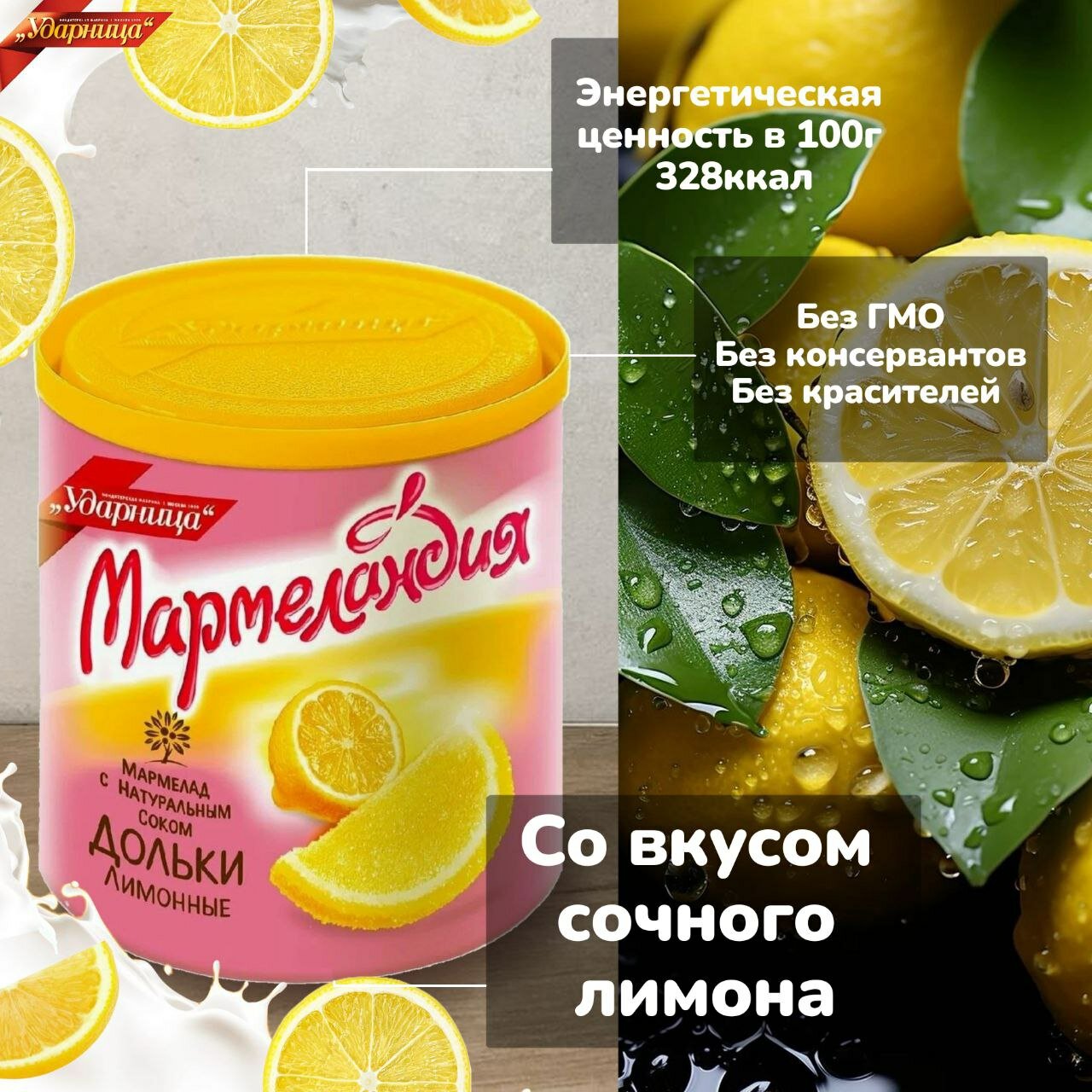 | Состав | Сахар, патока, агар, лактат натрия, лимонная кислота, белок гороха, краситель, цитрат натрия, экстракт лимона. |