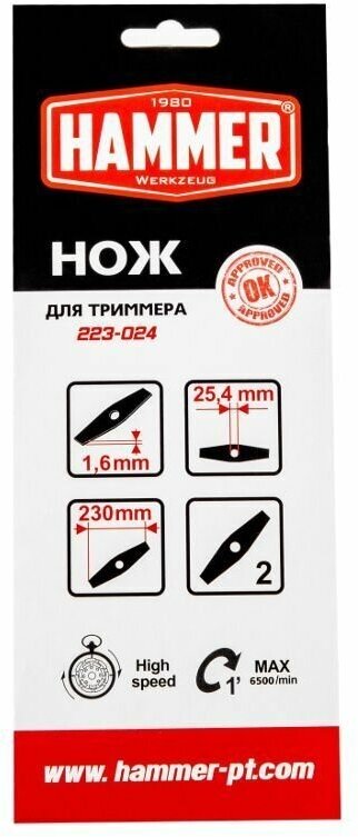 Нож для триммера Hammer Flex 223-024 2 зуба, толщина 1,6 мм, d 230 мм информация: