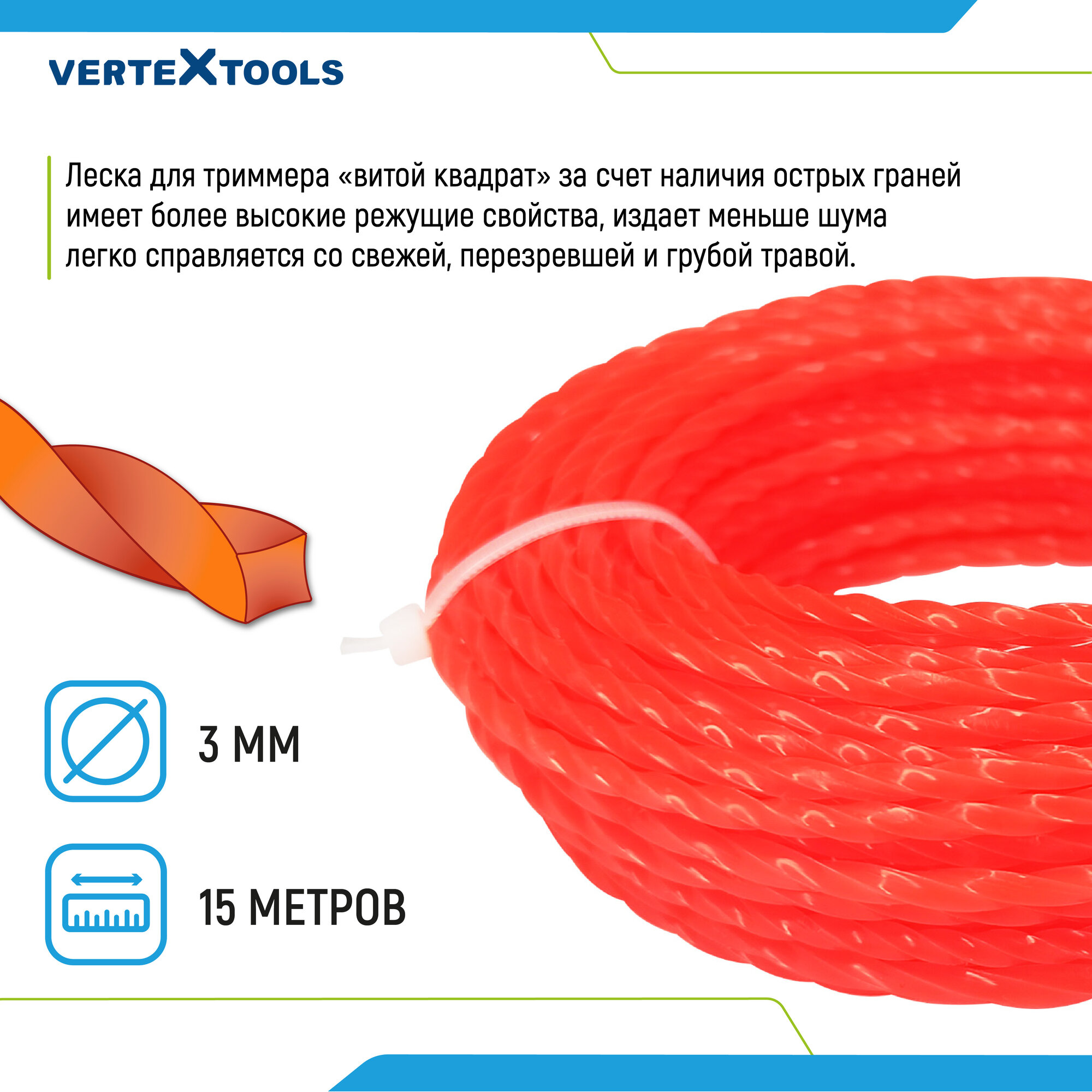 Леска для триммера VertexTools 2,4 мм 15 м витой квадрат с сердечником