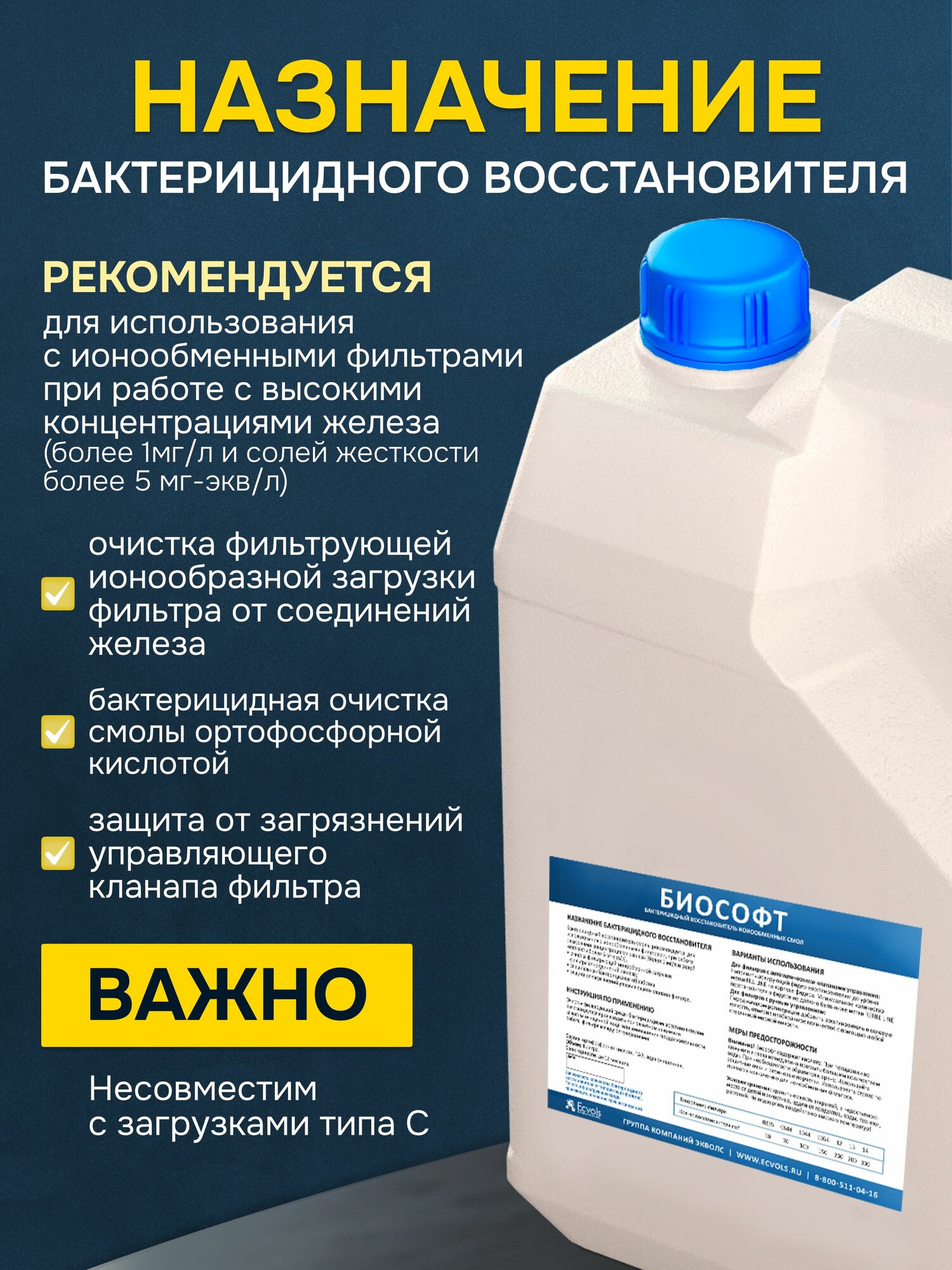 Реагент Ecvols Biosoft Биософт для восстановления ионообменной смолы, очистка от железа, марганца и бактерий, 4 л информация: