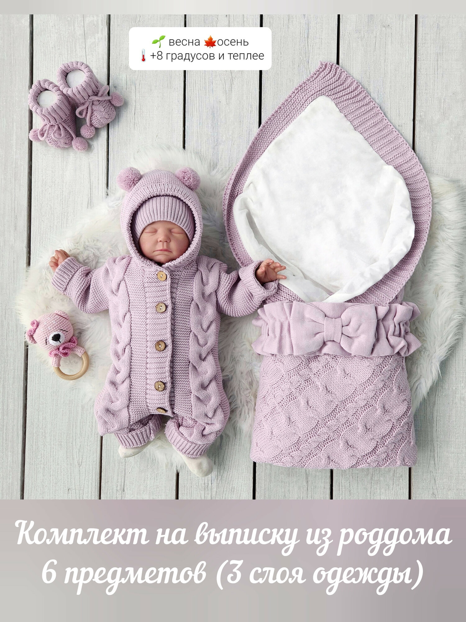 Отзывы на Комплект вязаный на выписку, вязаный. 6 предметов, размер 56-62, лаванда