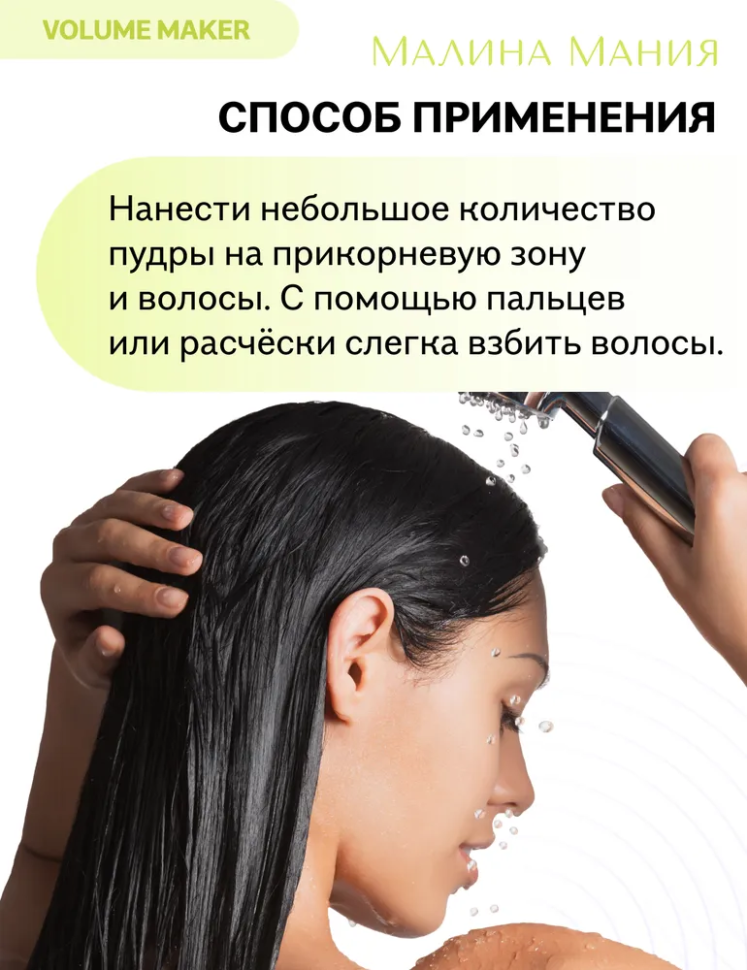 | Способ применения | Нанести небольшое количество пудры на прикорневую зону и волосы. С помощью пальцев или расчёски слегка взбить волосы. |