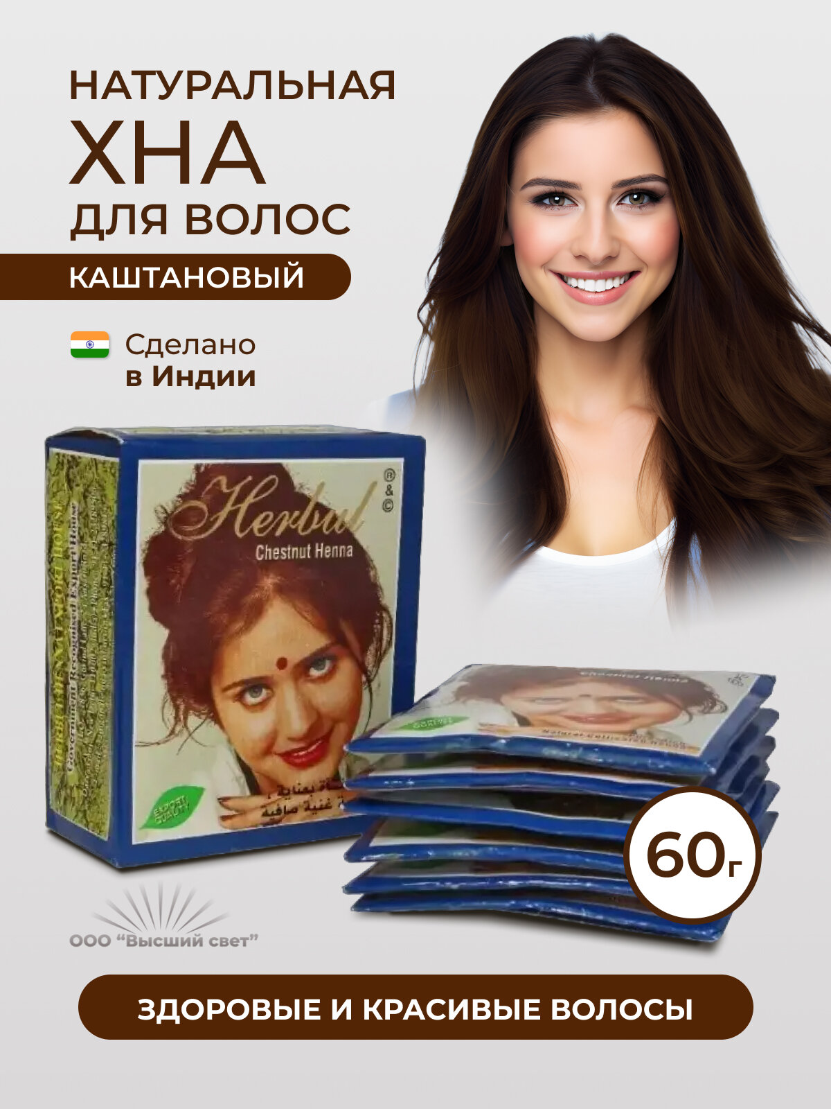10 цен на Хна каштановая для волос натуральная Индия Herbul, Укрепляет волосы, Закрашивает седину, 60 гр.