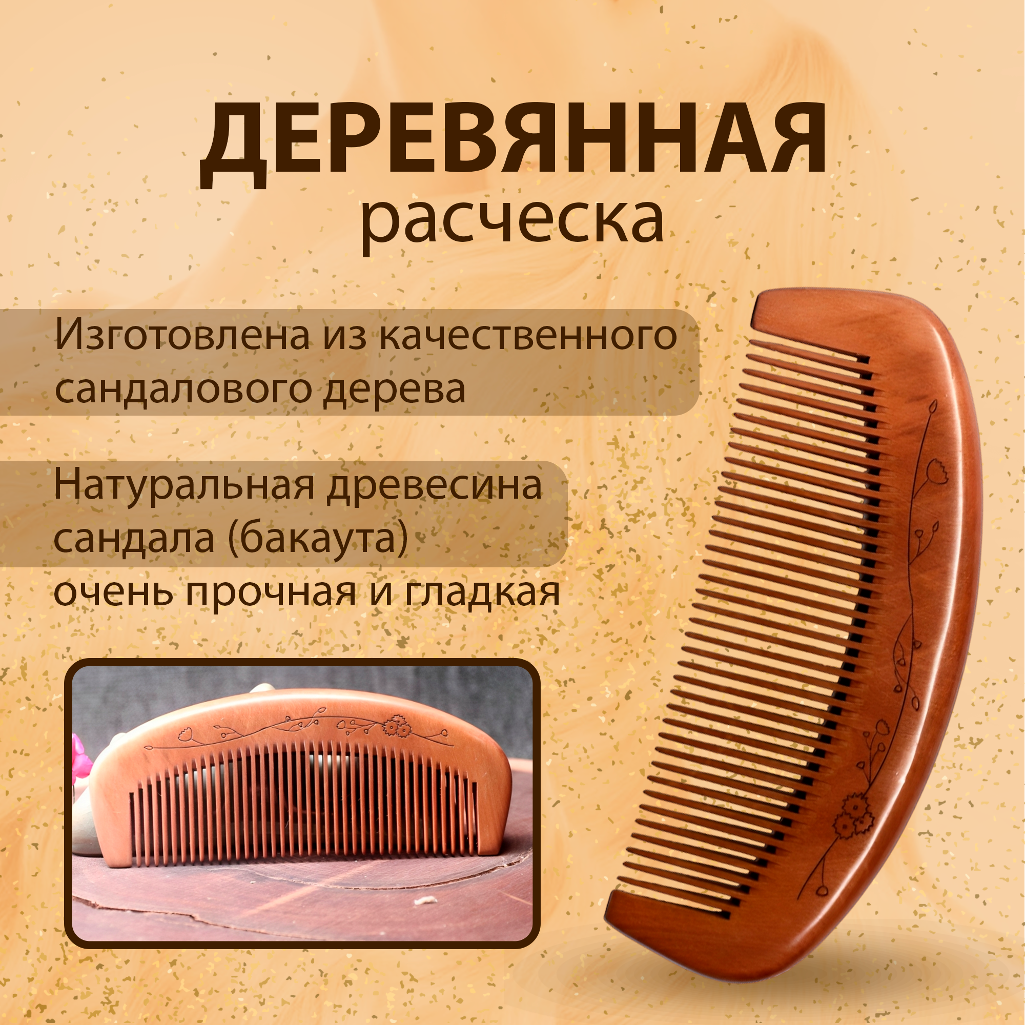 | Дополнительная информация | Сандаловая расческа прекрасно подходит для всех типов волос. Эта расческа может помочь вам, независимо от того какие у вас волосы: длинные, короткие, грубые или тонкие. Отлично подходит для распутывания волос малыша, а также ваших собственных. Расчесывание волос ребенка может быть травматичным опытом, но с этой расческой, которая легко и безболезненно удаляет спутанные волосы, это может стать легкой задачей. Может помочь улучшить кровообращение кожи головы, а так же при таких проблемах, как перхоть, тонкие или выпадающие волосы, а также она может сделать волосы сильными, блестящими и здоровыми. |