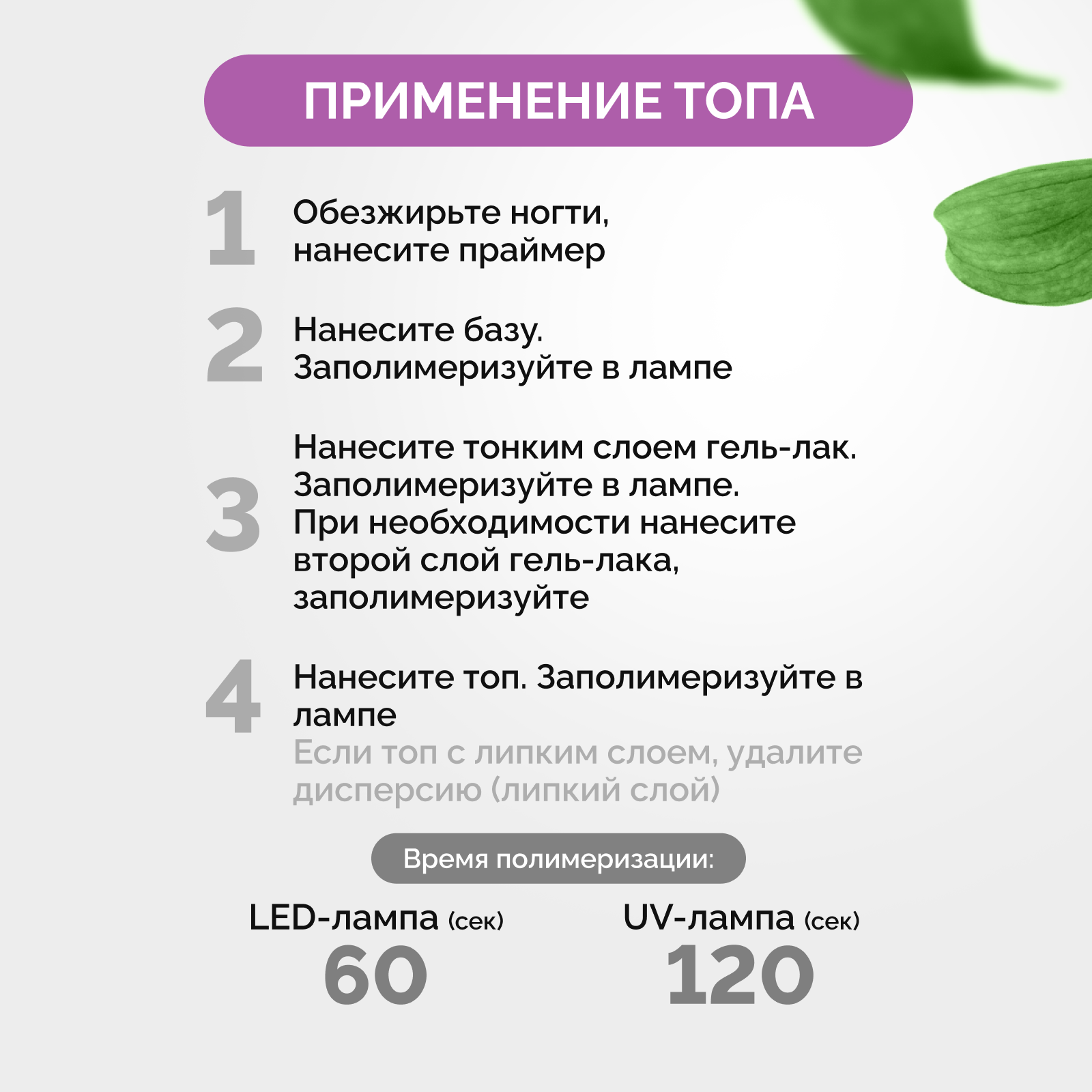 | Способ применения | Нанесение топа – завершающий этап маникюра. Рекомендованное время полимеризации в UV-лампе – 2 мин., в LED-лампе – 60 сек. Не требует снятия дисперсионного слоя. |