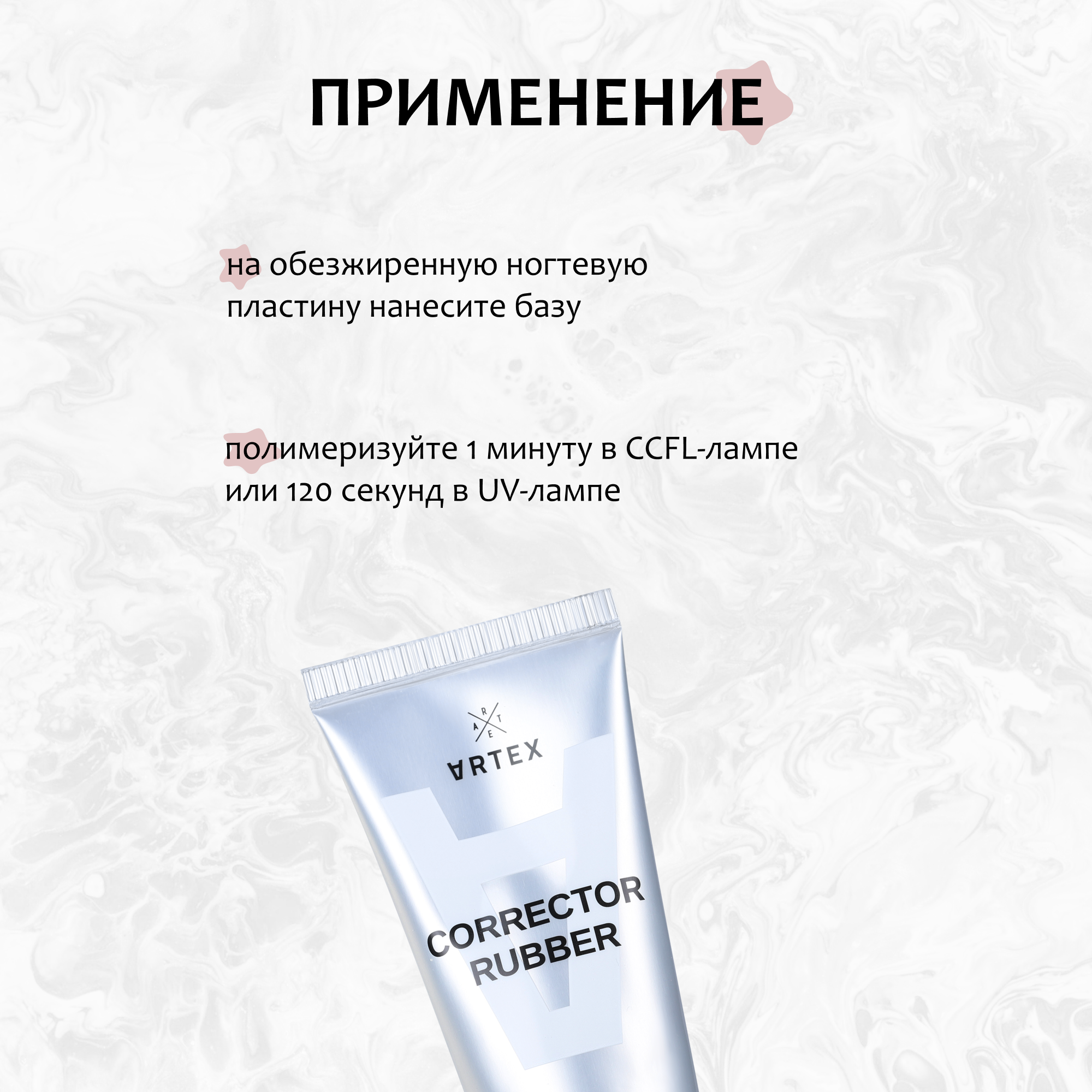 Способ применения | выполните маникюр, отодвиньте кутикулу, обработайте ногтевую пластину мягким бафом. Обезжирьте ногтевую пластину. Нанесите бескислотный праймер по необходимости на всю ногтевую пластину или свободный край ногтя. Нанесите Corrector Rubber c выравниванием ногтевой пластины. Полимеризация в лампе Сcfl 60 сек, UV 120 сек. Далее можно приступать к цветному покрытию |
