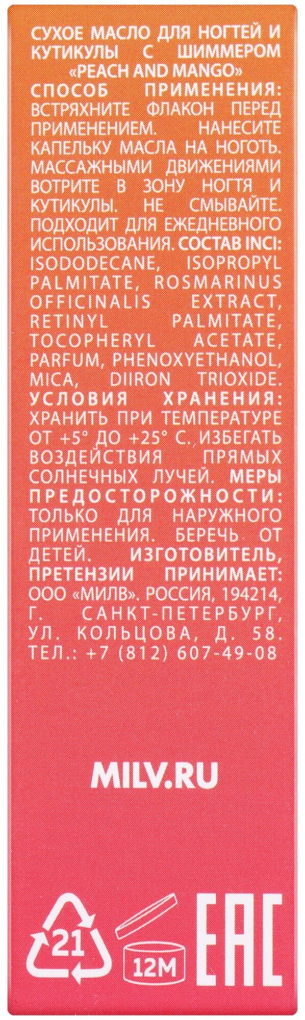 MILV Сухое укрепляющее масло для ногтей с шиммером "PEACH and MANGO". 15 мл информация: