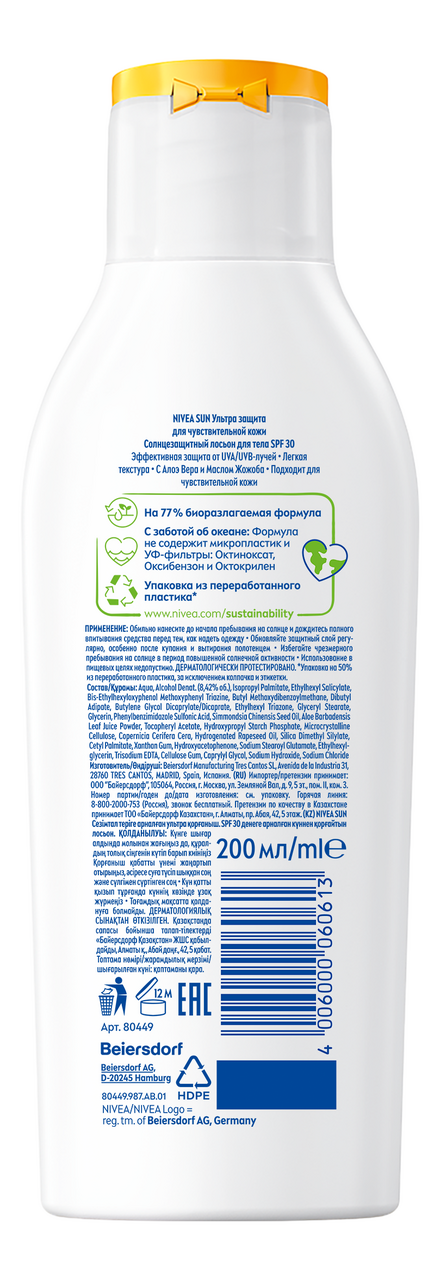 Солнцезащитный лосьон NIVEA SUN для чувствительной кожи SPF 30, 200 мл информация: