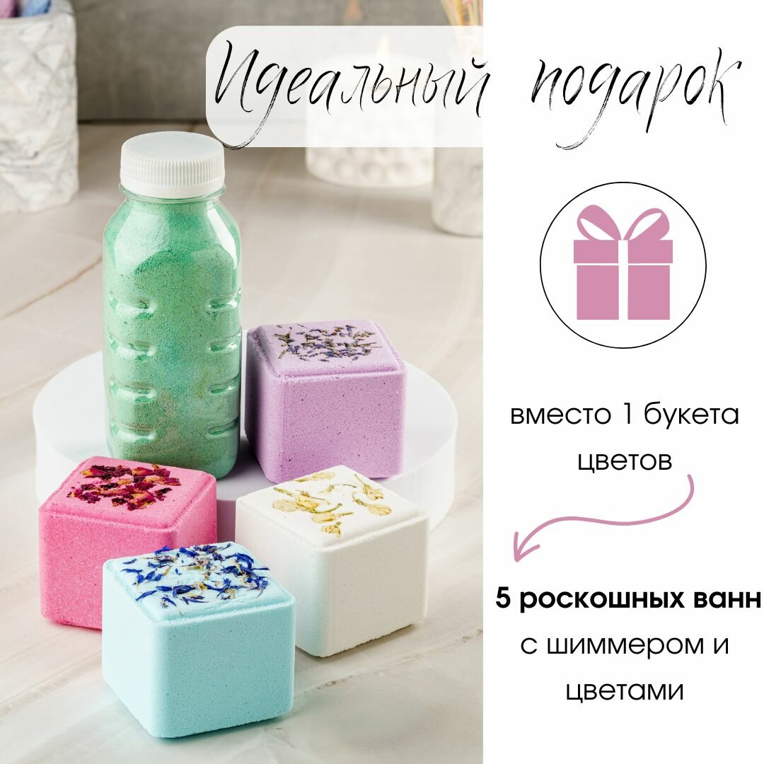 10 цен на СПА набор: перламутровый шиммер и 4 бомбочки для ванны с цветами - роза, лаванда, василек, жасмин.