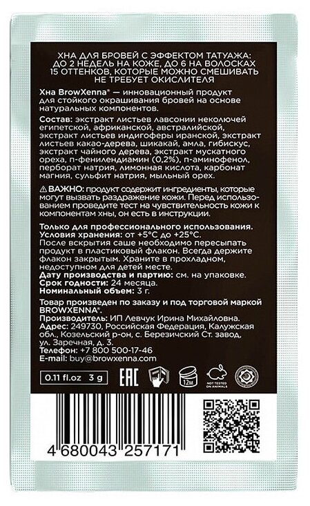 BrowXenna Хна для бровей midi-саше 3 гр, 104 горький шоколад, 3 г информация: