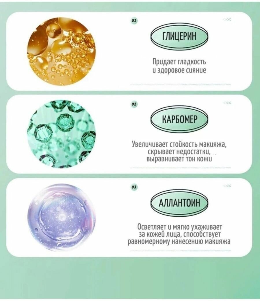 | Дополнительная информация | фиолетовый убирает желтизну лица; зелёный нейтрализует красноту, воспаления и раздражения розовый скрывает неровности кожи даёт мягкий ровный тон |
