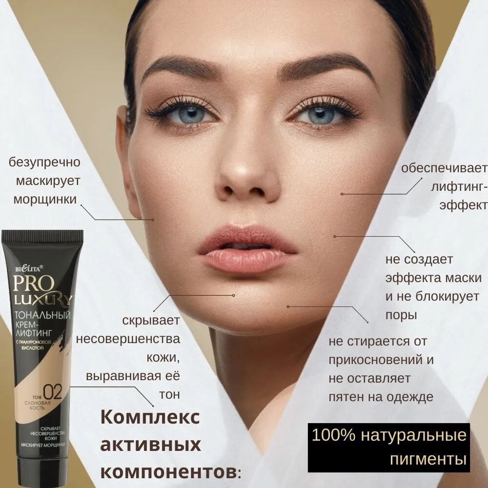 Белита Тональный крем для лица PRO LUXURY Лифтинг с гиалуроновой кислотой тон 02 слоновая кость 30 мл информация: