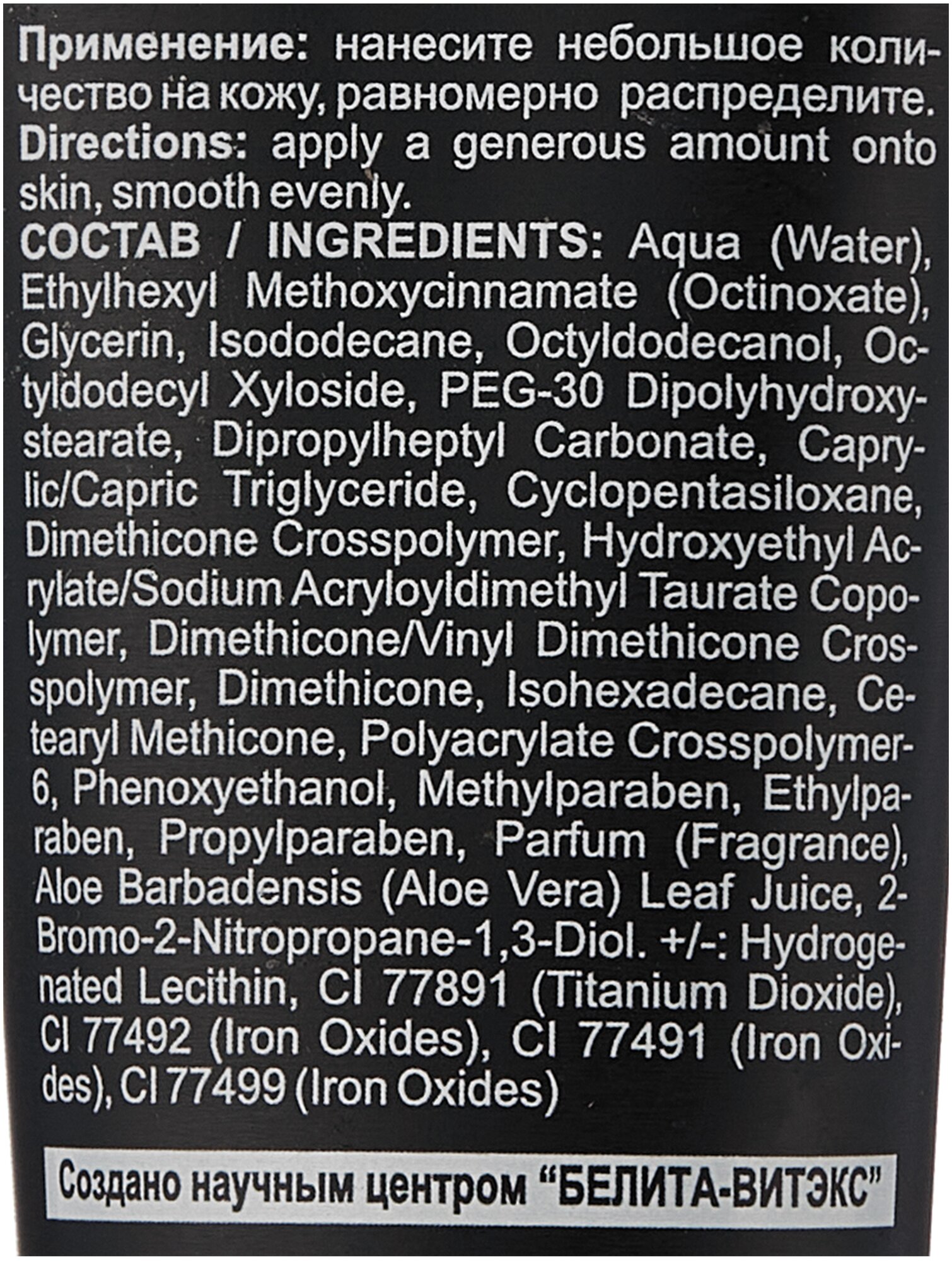 | Состав | вода, этилгексилметоксициннамат, глицерин, CI 77891, гидрогенизированный лецитин, изододекан, октилдодеканол, ксилозид октилдодеканола, ПЭГ-30 диполигидроксистеарат, дипропилгептилкарбонат, глицерилтрикаприлат/капрат, циклопентасилоксан, кроссполимер диметикона, сополимер гидроксиэтилакрилата/акрилоилдиметилтаурата натрия, кроссполимер диметикона/винилдиметикона, диметикон, изогексадекан, цетеарилметикон, CI 77492 (оксиды железа), гидрогенизированный лецитин, кроссполимер полиакрилата-6, феноксиэтанол, метилпарабен, этилпарабен, пропилпарабен, CI 77491 (оксиды железа), CI 77499 (оксиды железа), гидрогенизированный лецитин, CI 77499 (оксиды железа), гидрогенизированный лецитин, парфюмерная композиция, сок листьев Aloe barbadensis (алоэ), 2-бром-2-нитропропан-1,3-диол |