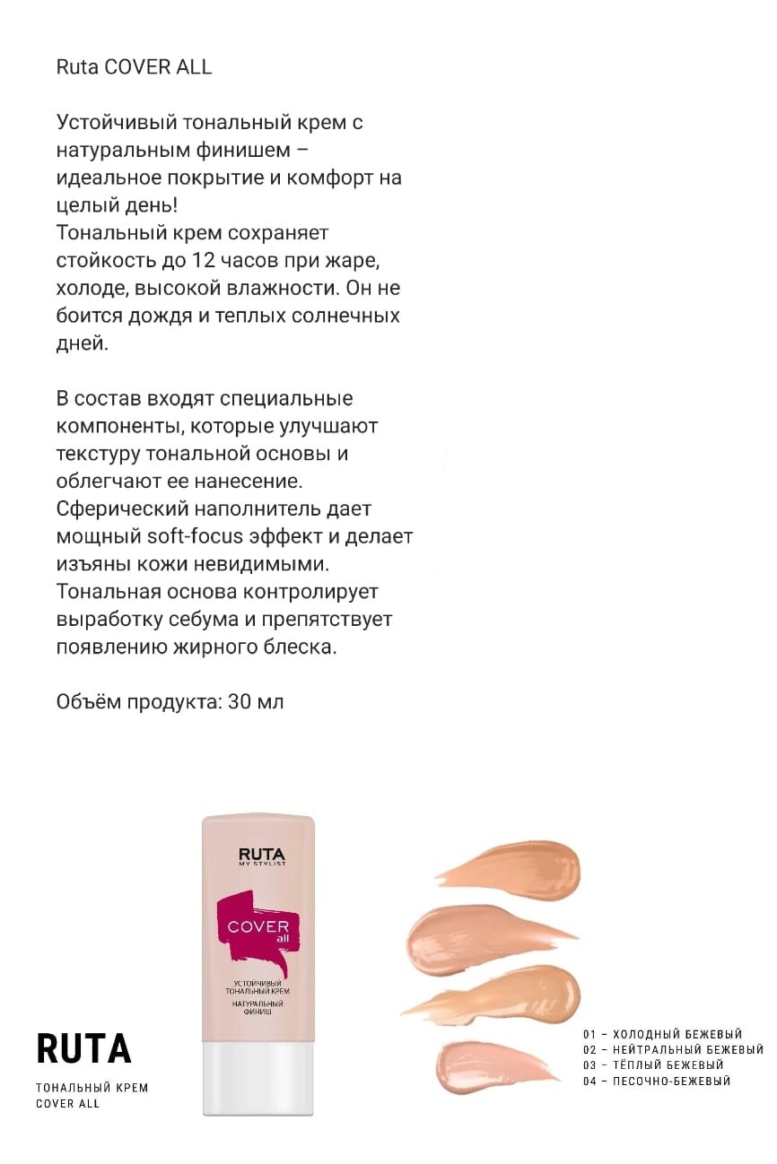 10 цен на Тональный крем Ruta Cover all устойчивый тон 02 Нейтральный бежевый 30 мл