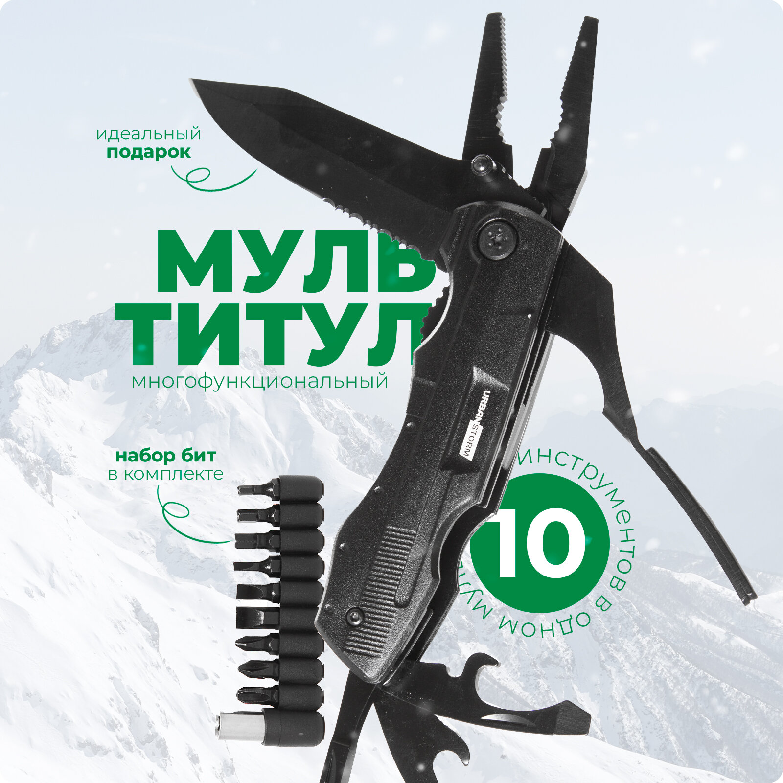 Отзывы на Мультитул 10 в 1 + набор 9 бит насадок (черный) UrbanStorm с чехлом, сталь 2cr13, многофункциональный, для авто, велосипеда, путешествий, рыбалки