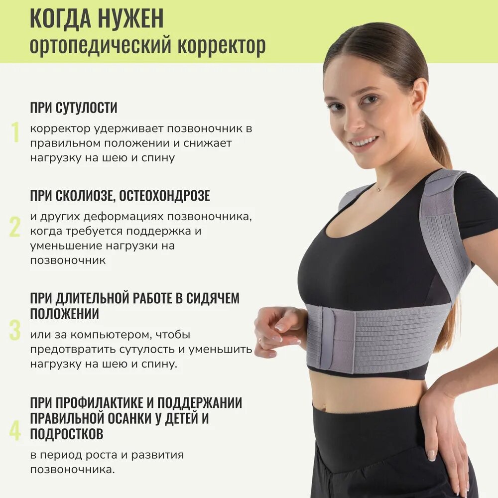 | Дополнительная информация | Корректор осанки используется при боли и дискомфорт в различных участках позвоночного столба, сколиоз, кифоз грудного отдела, сутулость, радикулит, поясничный лордоз, профилактика и лечение межпозвонковых грыж. Противопоказания: аллергическая реакция на материалы, беременность, легочная и сердечная недостаточность, ссадины и высыпания на тех участках кожи, с которыми корсет может соприкасаться. Необходима консультация с врачом |
