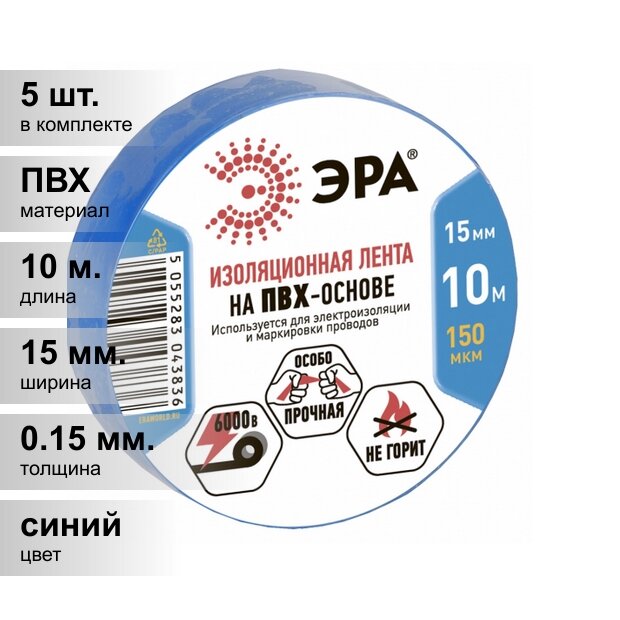 (5 шт.) Изолента ПВХ синяя 15мм 10м ЭРА информация: