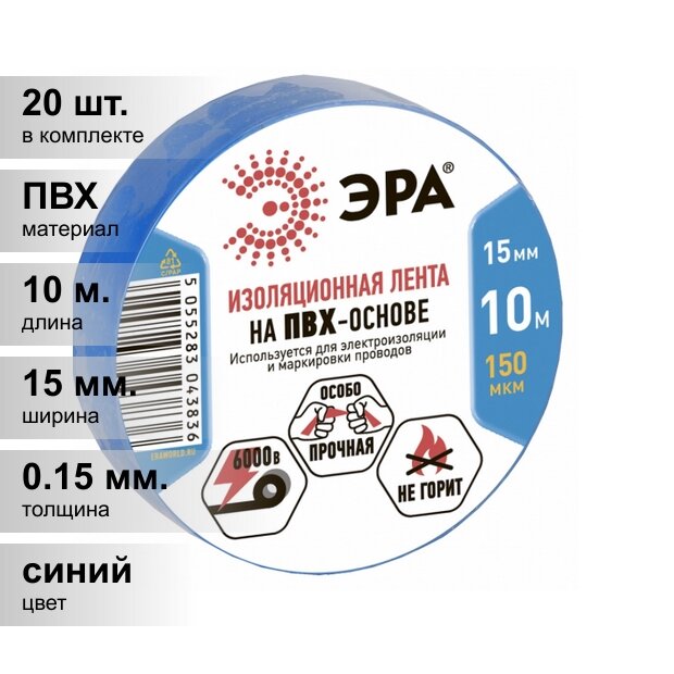 (20 шт.) Изолента ПВХ синяя 15мм 10м ЭРА информация: