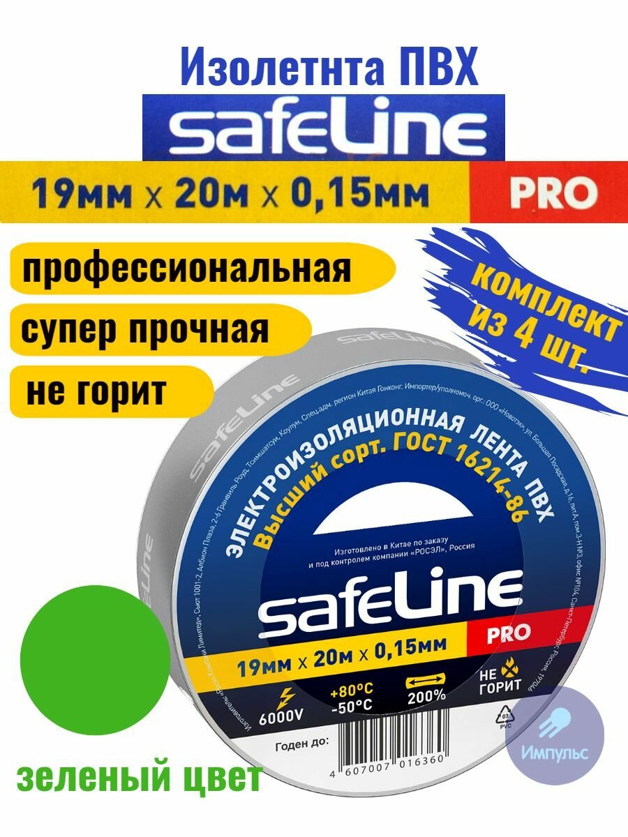 Изолента ПВХ зеленая 19мм 20м Safeline PRO (комплект из 4 шт.) информация: