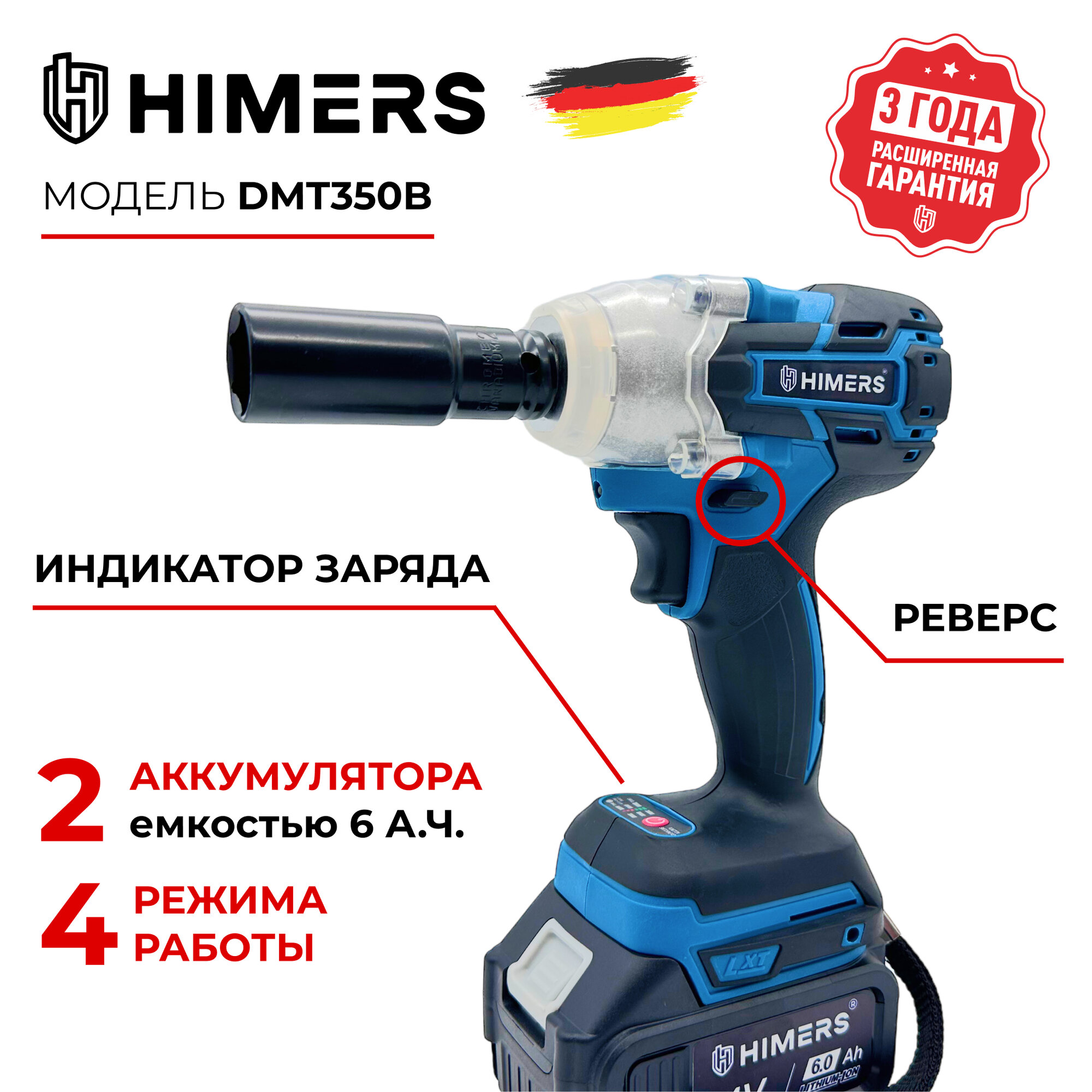 350 Н.М. Ударный бесщеточный гайковерт HIMERS DMT350B аккумуляторный 24V, 2 АКБ по 6 А.ч., Кейс / для закручивания, 24в, квадрат 1/2 + винтоверт под биту информация:
