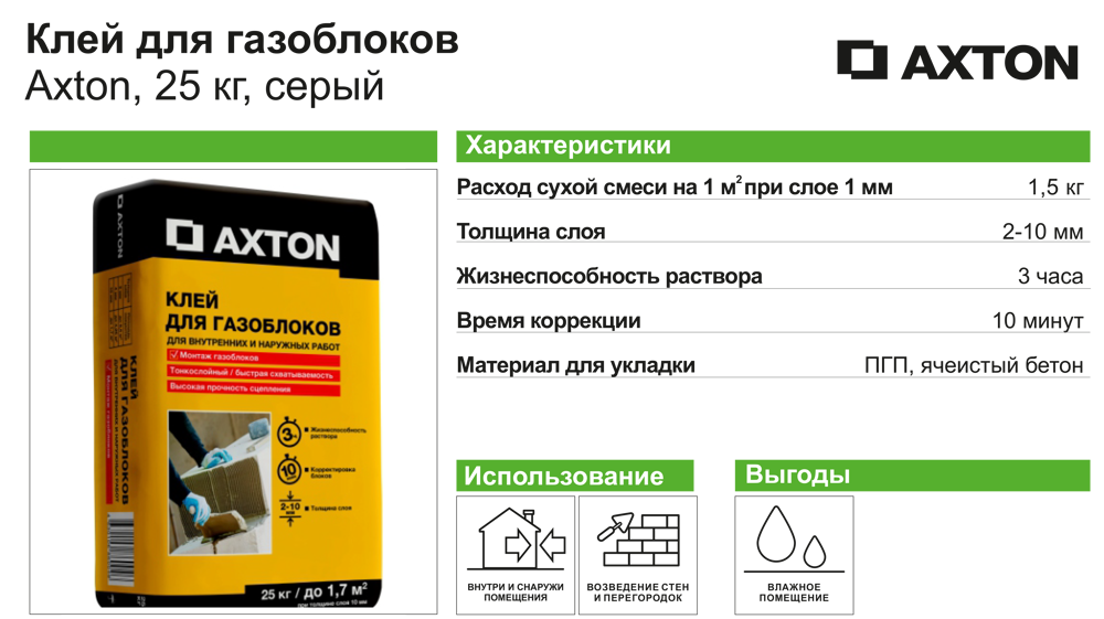 | Дополнительная информация | Клей для блоков Axton 25 кг |